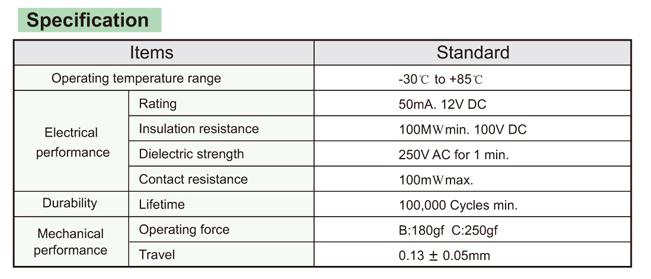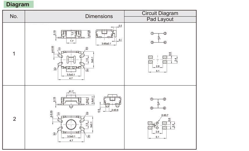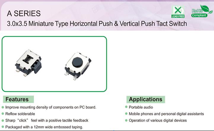尺寸: 3.5X3mm 產品分類: 輕觸開關 - A系列 / 迷你型 應用 ※ 便攜式音響 ※ 手機和掌上電腦 ※ 各種數碼設備的操作 特點 ※ 提高PCB組件的安裝密度 ※ 回流可焊 ※ 良好的點擊觸感 ※ 用12mm寬的編帶包裝