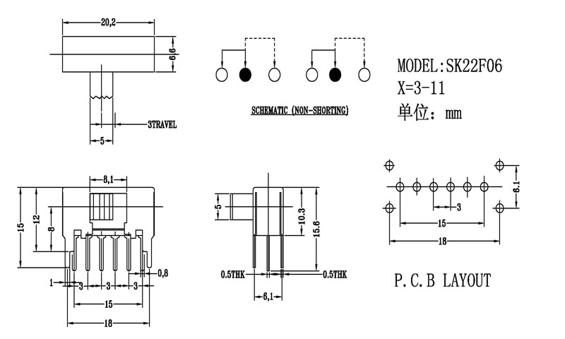 Slide Switch Main data Rating:DC 50V 0.3A~1A ContactResistance:< 100 mΩ InsulationResistance:≥ 100 MΩ Withstand Voltage:500V AC for 1 minute Operating Force:180~500gf Life cycles:10000次 Operationg Temperature:-16℃to+60℃ Storage Temperature:-40℃to+85℃ Complies with:RoHs&Reach