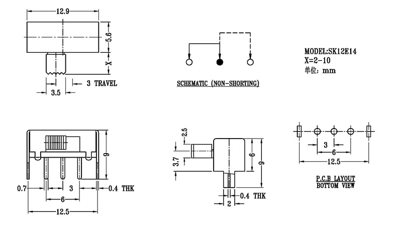Slide Switch Main data Rating:DC 50V 0.3A~1A ContactResistance:< 100 mΩ InsulationResistance:≥ 100 MΩ Withstand Voltage:500V AC for 1 minute Operating Force:180~500gf Life cycles:10000次 Operationg Temperature:-16℃to+60℃ Storage Temperature:-40℃to+85℃ Complies with:RoHs&Reach