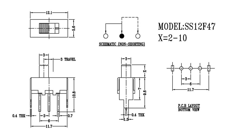 Slide Switch Main data Rating:DC 50V 0.3A~1A ContactResistance:< 100 mΩ InsulationResistance:≥ 100 MΩ Withstand Voltage:500V AC for 1 minute Operating Force:180~500gf Life cycles:10000次 Operationg Temperature:-16℃to+60℃ Storage Temperature:-40℃to+85℃ Complies with:RoHs&Reach