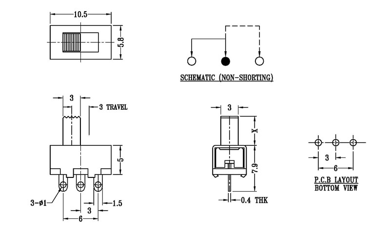 Slide Switch Main data Rating:DC 50V 0.3A~1A ContactResistance:< 100 mΩ InsulationResistance:≥ 100 MΩ Withstand Voltage:500V AC for 1 minute Operating Force:180~500gf Life cycles:10000次 Operationg Temperature:-16℃to+60℃ Storage Temperature:-40℃to+85℃ Complies with:RoHs&Reach