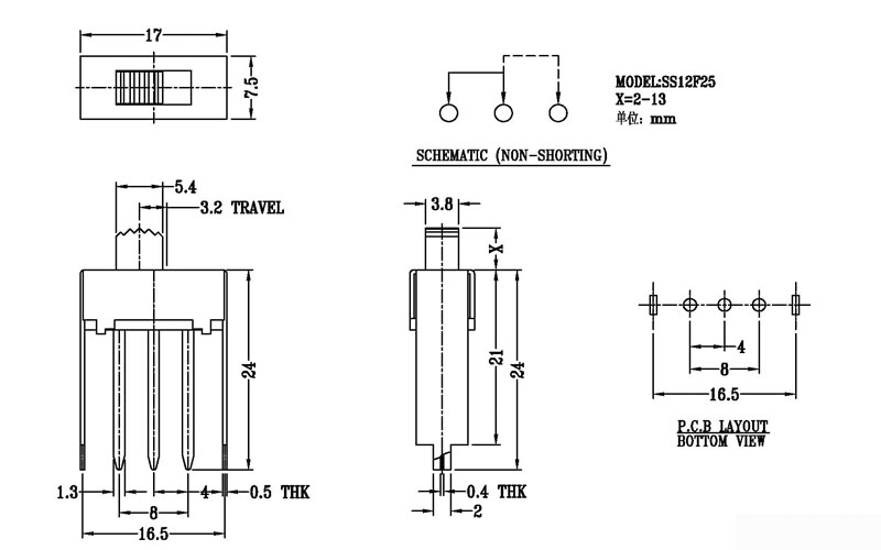 Slide Switch Main data Rating:DC 50V 0.3A~1A ContactResistance:< 100 mΩ InsulationResistance:≥ 100 MΩ Withstand Voltage:500V AC for 1 minute Operating Force:180~500gf Life cycles:10000次 Operationg Temperature:-16℃to+60℃ Storage Temperature:-40℃to+85℃ Complies with:RoHs&Reach