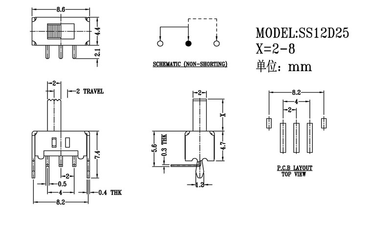 Slide Switch Main data Rating:DC 50V 0.3A~1A ContactResistance:< 100 mΩ InsulationResistance:≥ 100 MΩ Withstand Voltage:500V AC for 1 minute Operating Force:180~500gf Life cycles:10000次 Operationg Temperature:-16℃to+60℃ Storage Temperature:-40℃to+85℃ Complies with:RoHs&Reach