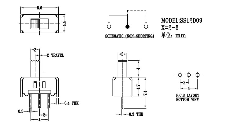 Slide Switch Main data Rating:DC 50V 0.3A~1A ContactResistance:< 100 mΩ InsulationResistance:≥ 100 MΩ Withstand Voltage:500V AC for 1 minute Operating Force:180~500gf Life cycles:10000次 Operationg Temperature:-16℃to+60℃ Storage Temperature:-40℃to+85℃ Complies with:RoHs&Reach