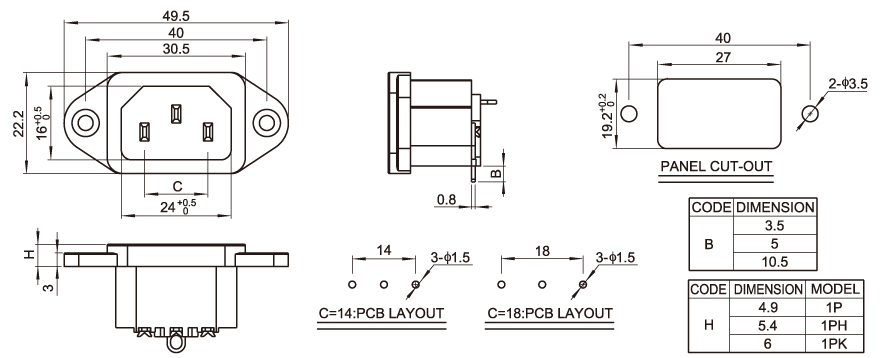 Standard: IEC 60320 C14 Rating:15A 250V AC / 10A 250V AC Insulation Resistance: 100MΩ 500V DC/1 minute Dielectric Strength: 2000V AC/1 minute Housing Material: Thermoplastic 94V-2~V-0
