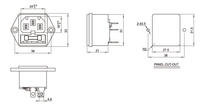 Standard: IEC 60320 C14 Rating:15A 250V AC / 10A 250V AC Insulation Resistance: 100MΩ 500V DC/1 minute Dielectric Strength: 2000V AC/1 minute Housing Material: Thermoplastic 94V-2~V-0
