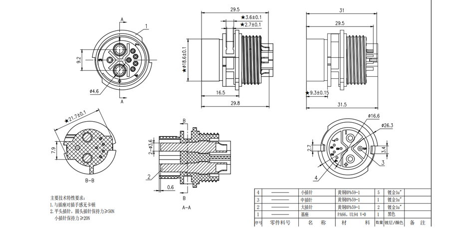 壽命:3000次 / 使用溫度:-20℃~80℃ / 型號:M23公頭2+1+5 / 黑色