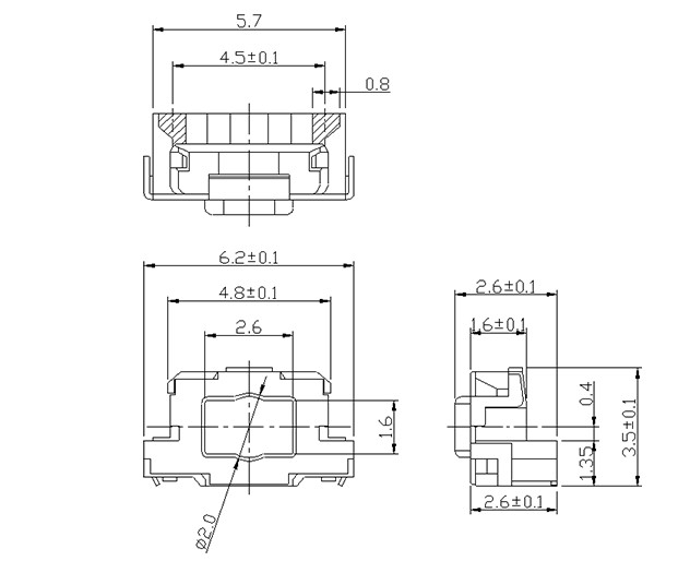 尺寸: 5.7X2.5mm 產(chǎn)品分類: 輕觸開關(guān) - A系列 / 迷你型 應(yīng)用 ※ 用于各種電子設(shè)備操作 ※ 音頻設(shè)備,辦公設(shè)備,通訊設(shè)備 ※ 測量儀器,電視機(jī),電視錄像機(jī)等 特點(diǎn) ※ 緊湊的低面貼片類型鍵盤開關(guān)設(shè)計(jì)用于高密度安裝 ※ 觸點(diǎn)完全封裝,提高可靠性 ※ 回流可焊 ※ 良好的點(diǎn)擊觸感