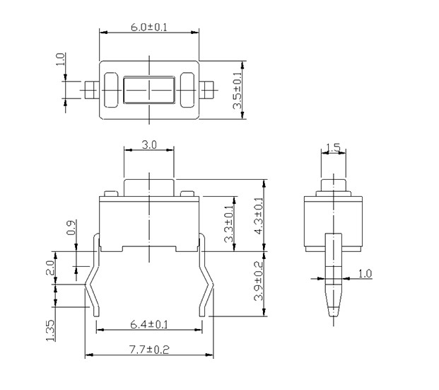 尺寸: 6.0x3.5mm 產品分類: 輕觸開關 - B系列 / 3x6一型二型 應用 ※ 各種電子設備像音響設備,辦公設備,通訊設備,測試儀器,電視機,錄像機等 特點 ※ 插腳類型,可以直接安在PCB上 ※ 良好的點擊觸感