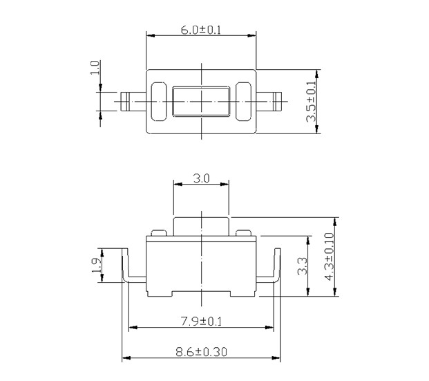 尺寸: 6.0X3.5mm 產品分類: 輕觸開關 - B系列 / 3x6一型二型 應用 ※ 用于各種電子設備操作 ※ 音頻設備,辦公設備,通訊設備 ※ 測量儀器,電視機,電視錄像機等 特點 ※ 緊湊的低面貼片類型鍵盤開關設計用于高密度安裝 ※ 觸點完全封裝,提高可靠性 ※ 回流可焊