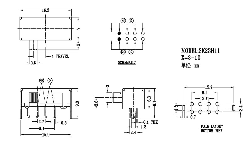 使用功率/額定值Rating:DC 50V 0.3A~1A 觸點電阻/Contact Resistance:< 100 mΩ 絕緣電阻/Insulation Resistance:≥ 100 MΩ 耐壓/Withstand Voltage:500V AC for 1 minute 使用壽命/Life cycles:10000次 操作溫度/Operationg Temperature:-16℃to+60℃ 儲存溫度/Storage Temperature:-40℃to+85℃ 符合標準/Complies with:RoHs&Reach