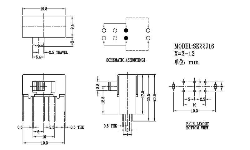 使用功率/額定值Rating:DC 50V 0.3A~1A 觸點電阻/Contact Resistance:< 100 mΩ 絕緣電阻/Insulation Resistance:≥ 100 MΩ 耐壓/Withstand Voltage:500V AC for 1 minute 使用壽命/Life cycles:10000次 操作溫度/Operationg Temperature:-16℃to+60℃ 儲存溫度/Storage Temperature:-40℃to+85℃ 符合標準/Complies with:RoHs&Reach