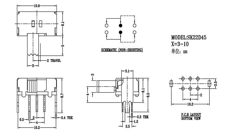 撥動開關主要技術參數: 使用功率/額定值:DC 50V 0.3A~1A 觸點電阻:< 100 mΩ 絕緣電阻:≥ 100 MΩ 耐壓:500V AC for 1 minute 撥動力:180~500gf 使用壽命:10000次 操作溫度:-16℃to+60℃ 儲存溫度:-40℃to+85℃ 符合標準:RoHs&Reach