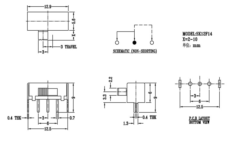 撥動開關主要技術參數: 使用功率/額定值:DC 50V 0.3A~1A 觸點電阻:< 100 mΩ 絕緣電阻:≥ 100 MΩ 耐壓:500V AC for 1 minute 撥動力:180~500gf 使用壽命:10000次 操作溫度:-16℃to+60℃ 儲存溫度:-40℃to+85℃ 符合標準:RoHs&Reach