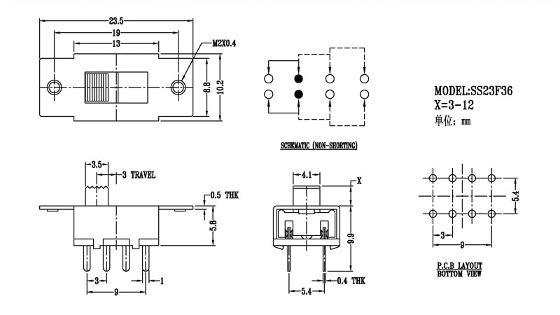 撥動開關主要技術參數: 使用功率/額定值:DC 50V 0.3A~1A 觸點電阻:< 100 mΩ 絕緣電阻:≥ 100 MΩ 耐壓:500V AC for 1 minute 撥動力:180~500gf 使用壽命:10000次 操作溫度:-16℃to+60℃ 儲存溫度:-40℃to+85℃ 符合標準:RoHs&Reach