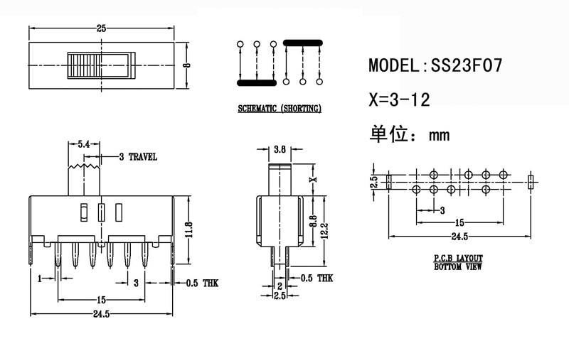 撥動開關(guān)主要技術(shù)參數(shù) 使用功率/額定值:DC 50V 0.3A~1A 觸點電阻:< 100 mΩ 絕緣電阻:≥ 100 MΩ 耐壓:500V AC for 1 minute 撥動力:180~500gf 使用壽命:10000次 操作溫度:-16℃to+60℃ 儲存溫度:-40℃to+85℃ 符合標準:RoHs&Reach