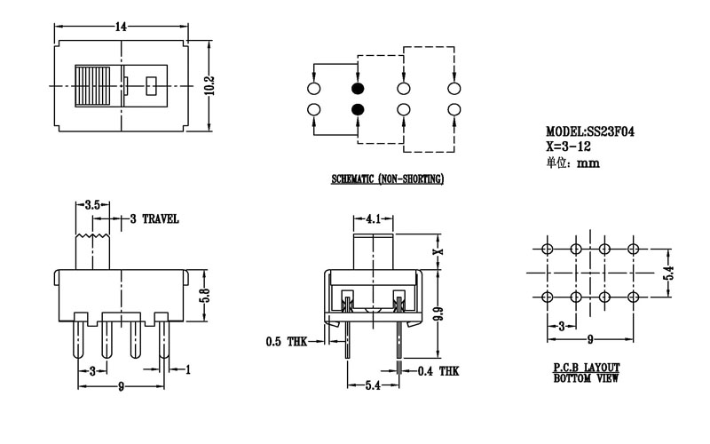 撥動開關(guān)主要技術(shù)參數(shù) 使用功率/額定值:DC 50V 0.3A~1A 觸點電阻:< 100 mΩ 絕緣電阻:≥ 100 MΩ 耐壓:500V AC for 1 minute 撥動力:180~500gf 使用壽命:10000次 操作溫度:-16℃to+60℃ 儲存溫度:-40℃to+85℃ 符合標準:RoHs&Reach