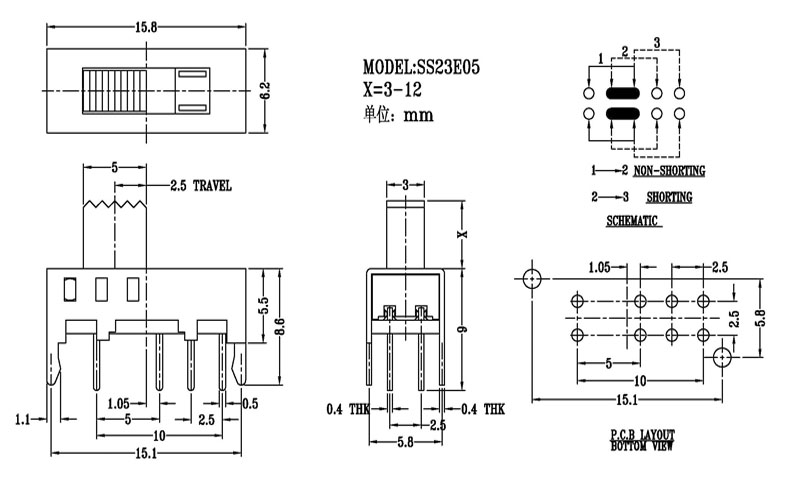 撥動開關主要技術參數(shù) 使用功率/額定值:DC 50V 0.3A~1A 觸點電阻:< 100 mΩ 絕緣電阻:≥ 100 MΩ 耐壓:500V AC for 1 minute 撥動力:180~500gf 使用壽命:10000次 操作溫度:-16℃to+60℃ 儲存溫度:-40℃to+85℃ 符合標準:RoHs&Reach