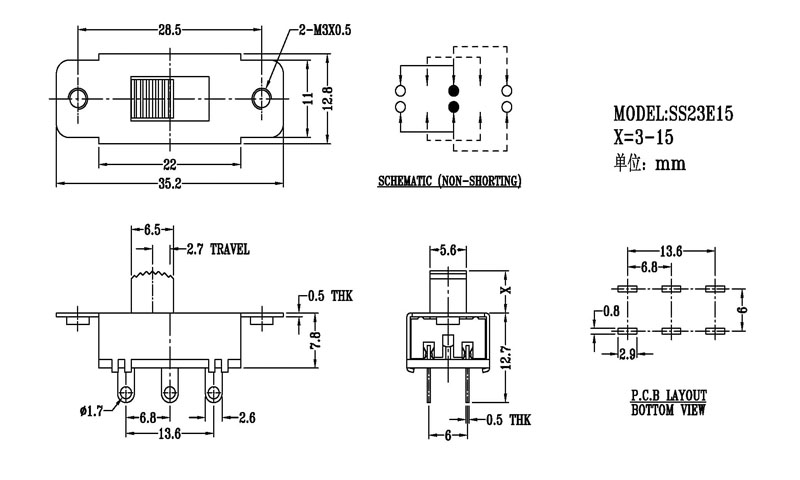 撥動開關主要技術參數 使用功率/額定值:DC 50V 0.3A~1A 觸點電阻:< 100 mΩ 絕緣電阻:≥ 100 MΩ 耐壓:500V AC for 1 minute 撥動力:180~500gf 使用壽命:10000次 操作溫度:-16℃to+60℃ 儲存溫度:-40℃to+85℃ 符合標準:RoHs&Reach