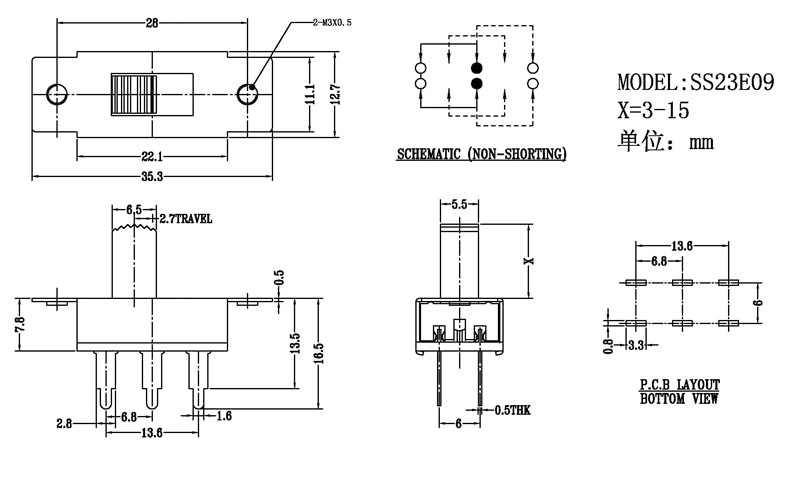正撥撥動(dòng)開(kāi)關(guān)主要技術(shù)參數(shù) 使用功率/額定值:DC 50V 0.3A~1A 觸點(diǎn)電阻:< 100 mΩ 絕緣電阻:≥ 100 MΩ 耐壓:500V AC for 1 minute 撥動(dòng)力:180~500gf 使用壽命:10000次 操作溫度:-16℃to+60℃ 儲(chǔ)存溫度:-40℃to+85℃ 符合標(biāo)準(zhǔn):RoHs&Reach