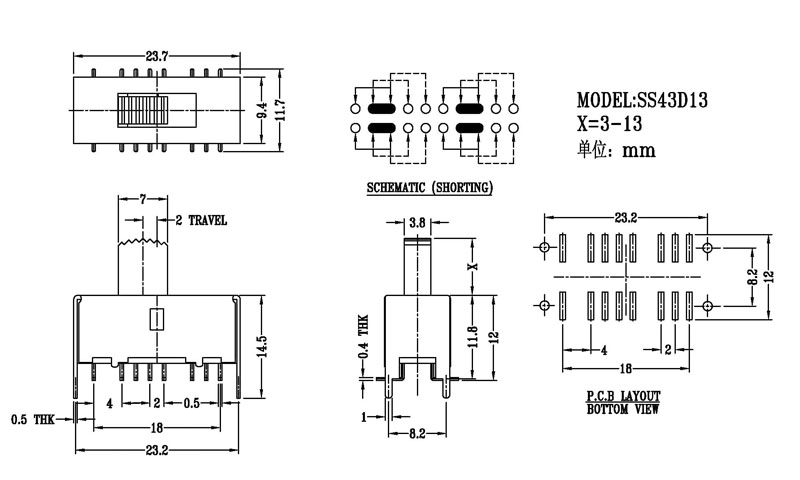 正撥撥動開關主要技術參數 使用功率/額定值:DC 50V 0.3A~1A 觸點電阻:< 100 mΩ 絕緣電阻:≥ 100 MΩ 耐壓:500V AC for 1 minute 撥動力:180~500gf 使用壽命:10000次 操作溫度:-16℃to+60℃ 儲存溫度:-40℃to+85℃ 符合標準:RoHs&Reach