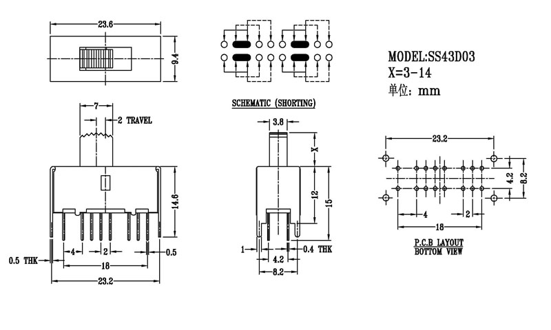 正撥撥動開關主要技術參數 使用功率/額定值:DC 50V 0.3A~1A 觸點電阻:< 100 mΩ 絕緣電阻:≥ 100 MΩ 耐壓:500V AC for 1 minute 撥動力:180~500gf 使用壽命:10000次 操作溫度:-16℃to+60℃ 儲存溫度:-40℃to+85℃ 符合標準:RoHs&Reach