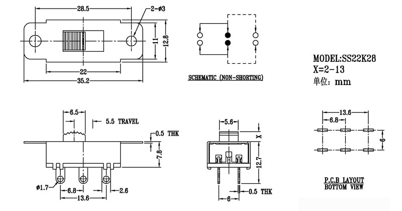 正撥撥動開關主要技術參數 使用功率/額定值:DC 50V 0.3A~1A 觸點電阻:< 100 mΩ 絕緣電阻:≥ 100 MΩ 耐壓:500V AC for 1 minute 撥動力:180~500gf 使用壽命:10000次 操作溫度:-16℃to+60℃ 儲存溫度:-40℃to+85℃ 符合標準:RoHs&Reach