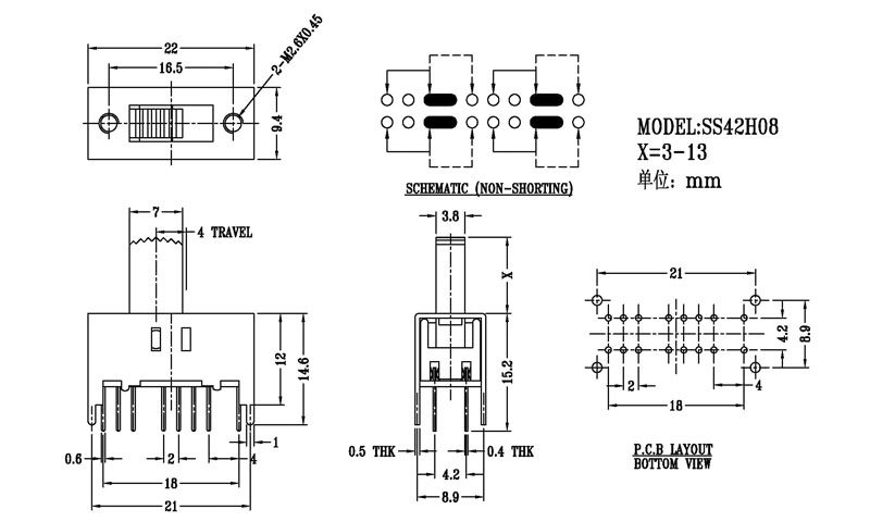 正撥撥動開關主要技術參數 使用功率/額定值:DC 50V 0.3A~1A 觸點電阻:< 100 mΩ 絕緣電阻:≥ 100 MΩ 耐壓:500V AC for 1 minute 撥動力:180~500gf 使用壽命:10000次 操作溫度:-16℃to+60℃ 儲存溫度:-40℃to+85℃ 符合標準:RoHs&Reach