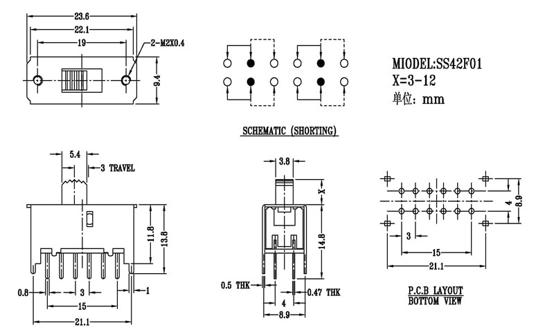 正撥撥動開關主要技術參數 使用功率/額定值:DC 50V 0.3A~1A 觸點電阻:< 100 mΩ 絕緣電阻:≥ 100 MΩ 耐壓:500V AC for 1 minute 撥動力:180~500gf 使用壽命:10000次 操作溫度:-16℃to+60℃ 儲存溫度:-40℃to+85℃ 符合標準:RoHs&Reach