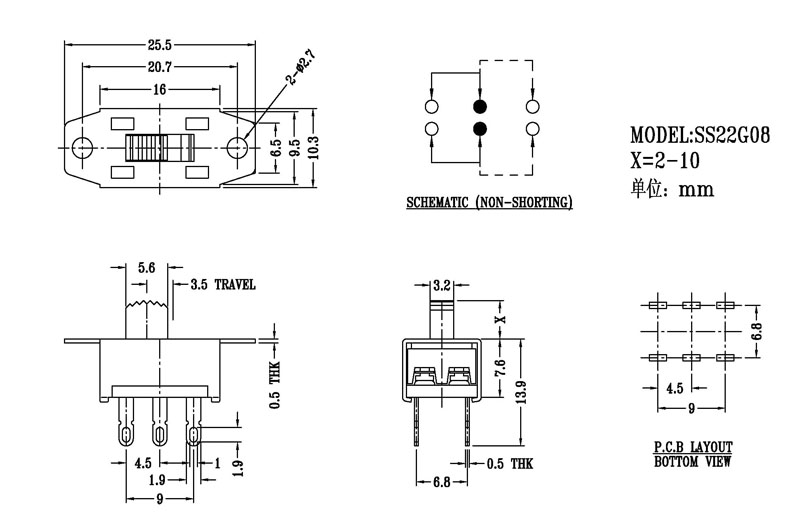 正撥撥動開關主要技術參數 使用功率/額定值:DC 50V 0.3A~1A 觸點電阻:< 100 mΩ 絕緣電阻:≥ 100 MΩ 耐壓:500V AC for 1 minute 撥動力:180~500gf 使用壽命:10000次 操作溫度:-16℃to+60℃ 儲存溫度:-40℃to+85℃ 符合標準:RoHs&Reach