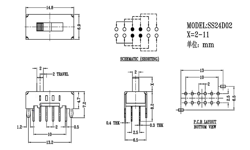 正撥撥動開關主要技術參數 使用功率/額定值:DC 50V 0.3A~1A 觸點電阻:< 100 mΩ 絕緣電阻:≥ 100 MΩ 耐壓:500V AC for 1 minute 撥動力:180~500gf 使用壽命:10000次 操作溫度:-16℃to+60℃ 儲存溫度:-40℃to+85℃ 符合標準:RoHs&Reach