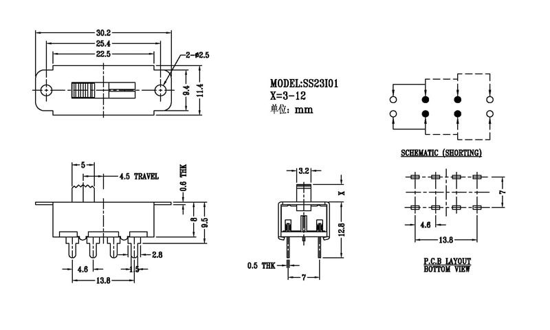 正撥撥動開關主要技術參數 使用功率/額定值:DC 50V 0.3A~1A 觸點電阻:< 100 mΩ 絕緣電阻:≥ 100 MΩ 耐壓:500V AC for 1 minute 撥動力:180~500gf 使用壽命:10000次 操作溫度:-16℃to+60℃ 儲存溫度:-40℃to+85℃ 符合標準:RoHs&Reach