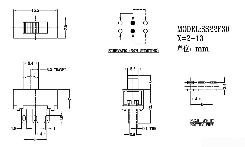 正撥撥動開關主要技術參數 使用功率/額定值:DC 50V 0.3A~1A 觸點電阻:< 100 mΩ 絕緣電阻:≥ 100 MΩ 耐壓:500V AC for 1 minute 撥動力:180~500gf 使用壽命:10000次 操作溫度:-16℃to+60℃ 儲存溫度:-40℃to+85℃ 符合標準:RoHs&Reach