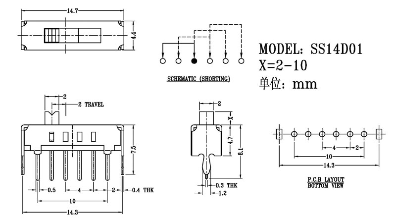 正撥撥動開關主要技術參數 使用功率/額定值:DC 50V 0.3A~1A 觸點電阻:< 100 mΩ 絕緣電阻:≥ 100 MΩ 耐壓:500V AC for 1 minute 撥動力:180~500gf 使用壽命:10000次 操作溫度:-16℃to+60℃ 儲存溫度:-40℃to+85℃ 符合標準:RoHs&Reach