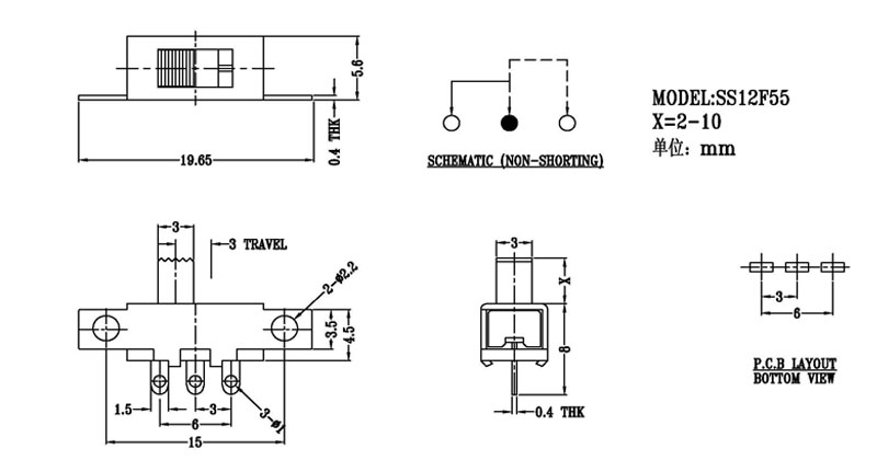 正撥撥動(dòng)開(kāi)關(guān)主要技術(shù)參數(shù) 使用功率/額定值:DC 50V 0.3A~1A 觸點(diǎn)電阻:< 100 mΩ 絕緣電阻:≥ 100 MΩ 耐壓:500V AC for 1 minute 撥動(dòng)力:180~500gf 使用壽命:10000次 操作溫度:-16℃to+60℃ 儲(chǔ)存溫度:-40℃to+85℃ 符合標(biāo)準(zhǔn):RoHs&Reach
