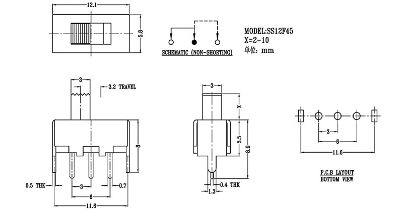正撥撥動(dòng)開關(guān)主要技術(shù)參數(shù) 使用功率/額定值:DC 50V 0.3A~1A 觸點(diǎn)電阻:< 100 mΩ 絕緣電阻:≥ 100 MΩ 耐壓:500V AC for 1 minute 撥動(dòng)力:180~500gf 使用壽命:10000次 操作溫度:-16℃to+60℃ 儲(chǔ)存溫度:-40℃to+85℃ 符合標(biāo)準(zhǔn):RoHs&Reach