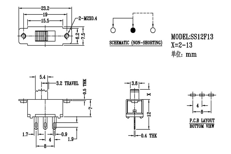 正撥撥動開關主要技術參數 使用功率/額定值:DC 50V 0.3A~1A 觸點電阻:< 100 mΩ 絕緣電阻:≥ 100 MΩ 耐壓:500V AC for 1 minute 撥動力:180~500gf 使用壽命:10000次 操作溫度:-16℃to+60℃ 儲存溫度:-40℃to+85℃ 符合標準:RoHs&Reach