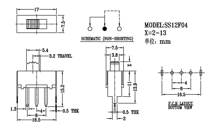 正撥撥動開關主要技術參數 使用功率/額定值:DC 50V 0.3A~1A 觸點電阻:< 100 mΩ 絕緣電阻:≥ 100 MΩ 耐壓:500V AC for 1 minute 撥動力:180~500gf 使用壽命:10000次 操作溫度:-16℃to+60℃ 儲存溫度:-40℃to+85℃ 符合標準:RoHs&Reach