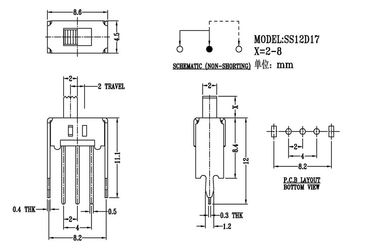 正撥撥動開關主要技術參數 使用功率/額定值:DC 50V 0.3A~1A 觸點電阻:< 100 mΩ 絕緣電阻:≥ 100 MΩ 耐壓:500V AC for 1 minute 撥動力:180~500gf 使用壽命:10000次 操作溫度:-16℃to+60℃ 儲存溫度:-40℃to+85℃ 符合標準:RoHs&Reach