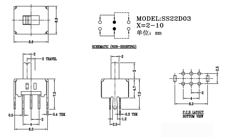 正撥撥動開關主要技術參數(shù) 使用功率/額定值:DC 50V 0.3A~1A 觸點電阻:< 100 mΩ 絕緣電阻:≥ 100 MΩ 耐壓:500V AC for 1 minute 撥動力:180~500gf 使用壽命:10000次 操作溫度:-16℃to+60℃ 儲存溫度:-40℃to+85℃ 符合標準:RoHs&Reach