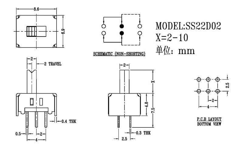 正撥撥動開關主要技術參數 使用功率/額定值:DC 50V 0.3A~1A 觸點電阻:< 100 mΩ 絕緣電阻:≥ 100 MΩ 耐壓:500V AC for 1 minute 撥動力:180~500gf 使用壽命:10000次 操作溫度:-16℃to+60℃ 儲存溫度:-40℃to+85℃ 符合標準:RoHs&Reach