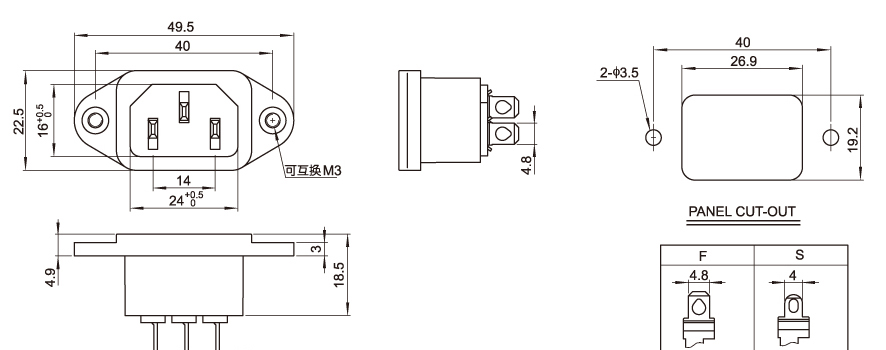 型 號:DB-14-1F: 關健詞:品字尾插座、品字尾電源插座、品字插座、AC電源插座、器具插座 用 途:小家電品字電源;主機機箱插座;電瓶車電源插座;電器插座 尺 寸:49.5*22.5 電流電壓:10A 250V