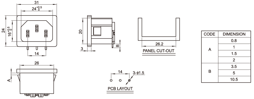型 號:DB-14-4P-55: 關健詞:品字尾插座、品字尾電源插座、品字插座、AC電源插座、器具插座 用 途:小家電品字電源;主機機箱插座;電瓶車電源插座;電器插座 尺 寸:31*24 電流電壓:10A 250V