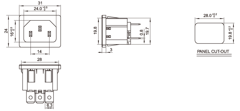 型 號:DB-14-5P-WW: 關健詞:品字尾插座、品字尾電源插座、品字插座、AC電源插座、器具插座 用 途:小家電品字電源;主機機箱插座;電瓶車電源插座;電器插座 尺 寸:31*24 電流電壓:10A 250V