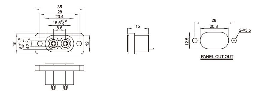 型 號:DB-8-7S1: 關健詞:八字插座:八字尾插座;適配器電源插座 用 途:電源適配器:筆記本電源;醫療器械電源;充電器; 尺 寸:35*15 電流電壓:2.5A 250V