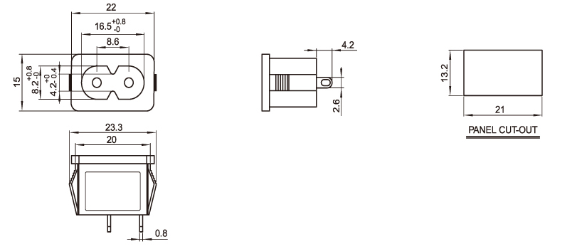 型 號:DB-8-19AS1: 關健詞:八字插座:八字尾插座;適配器電源插座 用 途:電源適配器:筆記本電源;醫療器械電源;充電器; 尺 寸:22*15 電流電壓:2.5A 250V