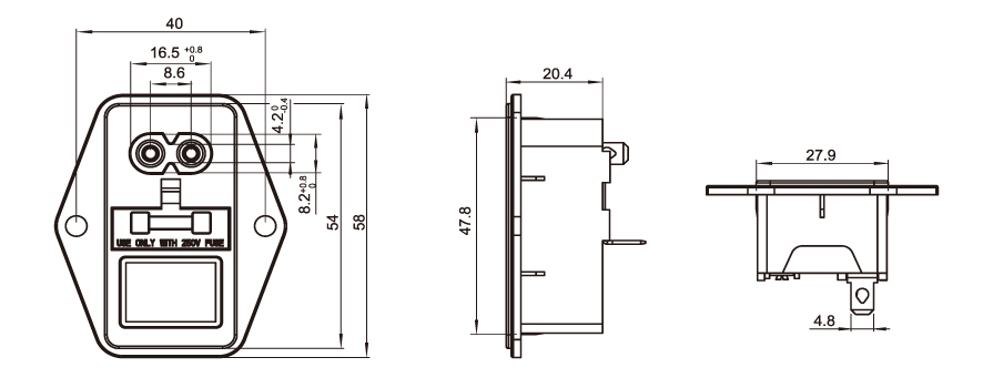 型 號:DB-8-F: 關健詞:八字插座:八字尾插座;適配器電源插座 用 途:電源適配器:筆記本電源;醫療器械電源;充電器; 尺 寸:40*58 電流電壓:2.5A 250V