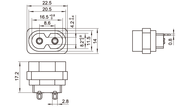 標(biāo)準(zhǔn):IEC 60320 C8 額定功率:2.5A 250V AC 絕緣電阻:100MΩ 500V DC/1分鐘 絕緣強(qiáng)度:2000V AC/1分鐘 外殼材料:熱塑性塑料 94V-2~V-0