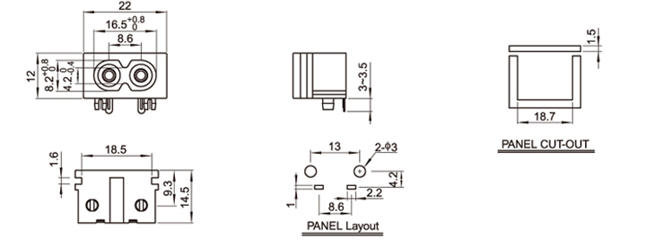 標準:IEC 60320 C8 額定功率:2.5A 250V AC 絕緣電阻:100MΩ 500V DC/1分鐘 絕緣強度:2000V AC/1分鐘 外殼材料:熱塑性塑料 94V-2~V-0