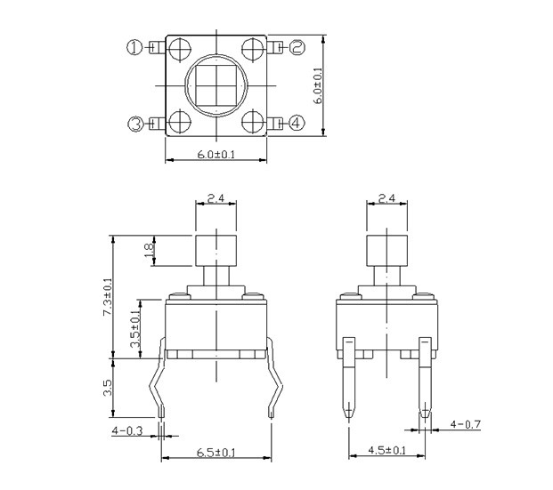 特點: 直按 尺寸: 6.0X6.0mm 產品分類: 輕觸開關 - D系列 / 6x6 應用 ※ 各種電子設備像音響設備,辦公設備,通訊設備,測試儀器,電視機,錄像機,汽車等 特點 ※ 插腳類型,可以直接安在PCB上 ※ 一些輸出腳可以做為引腳讓電路設計更簡單 ※ 可做防靜電接地腳 ※ 標準的帽子是可以做的